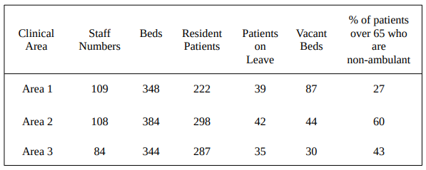 5.62 It is impossible to walk round St. Augustine's using one's eyes and talking to the staff without becoming rapidly aware that Clinical Area 1 seems, and is considered, to be much better off in all respects than the other two areas, particularly Clinical Area 2 which is regarded as the Cinderella. A careful check should have been kept to see whether any adjustments were needed to the geographical areas or the resources allocated to them. The following table provides statistics which demand careful consideration by the hospital and the District Management Team: